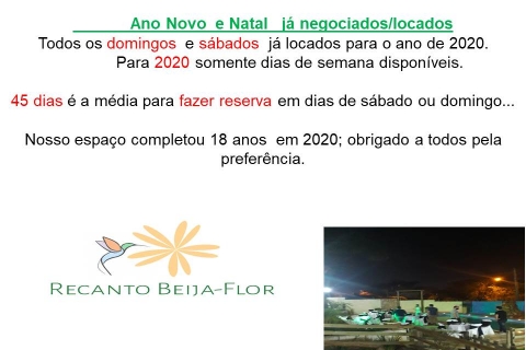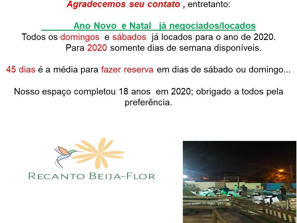 Indicado para eventos sociais , aniversários, casamento, chá revelação, bebê, fraldas..., noivado, churrasco, confraternização de empresas, bodas de casamentos, batizado e outros.Eventos após as 23:00hs não locamos , exceto datas especiais como natal, ano novo e carnaval.